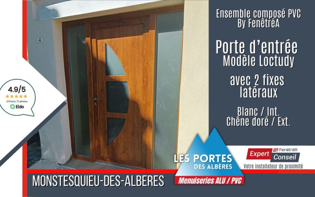 Dans le vieux centre de Montesquieu-des-Albères, nos clients nous ont fait confiance pour remplacer leur ancienne porte de garage bois par une porte d’entrée avec 2 fixes latéraux en PVC couleur Chêne doré à l’extérieur et Blanc à l’intérieur.